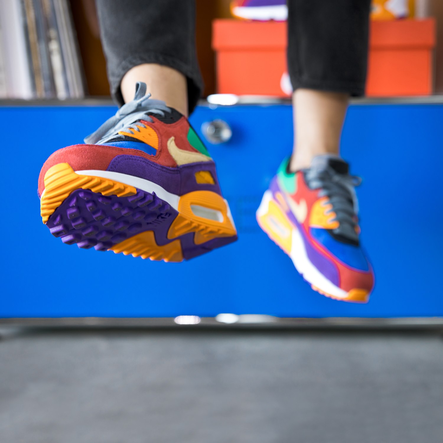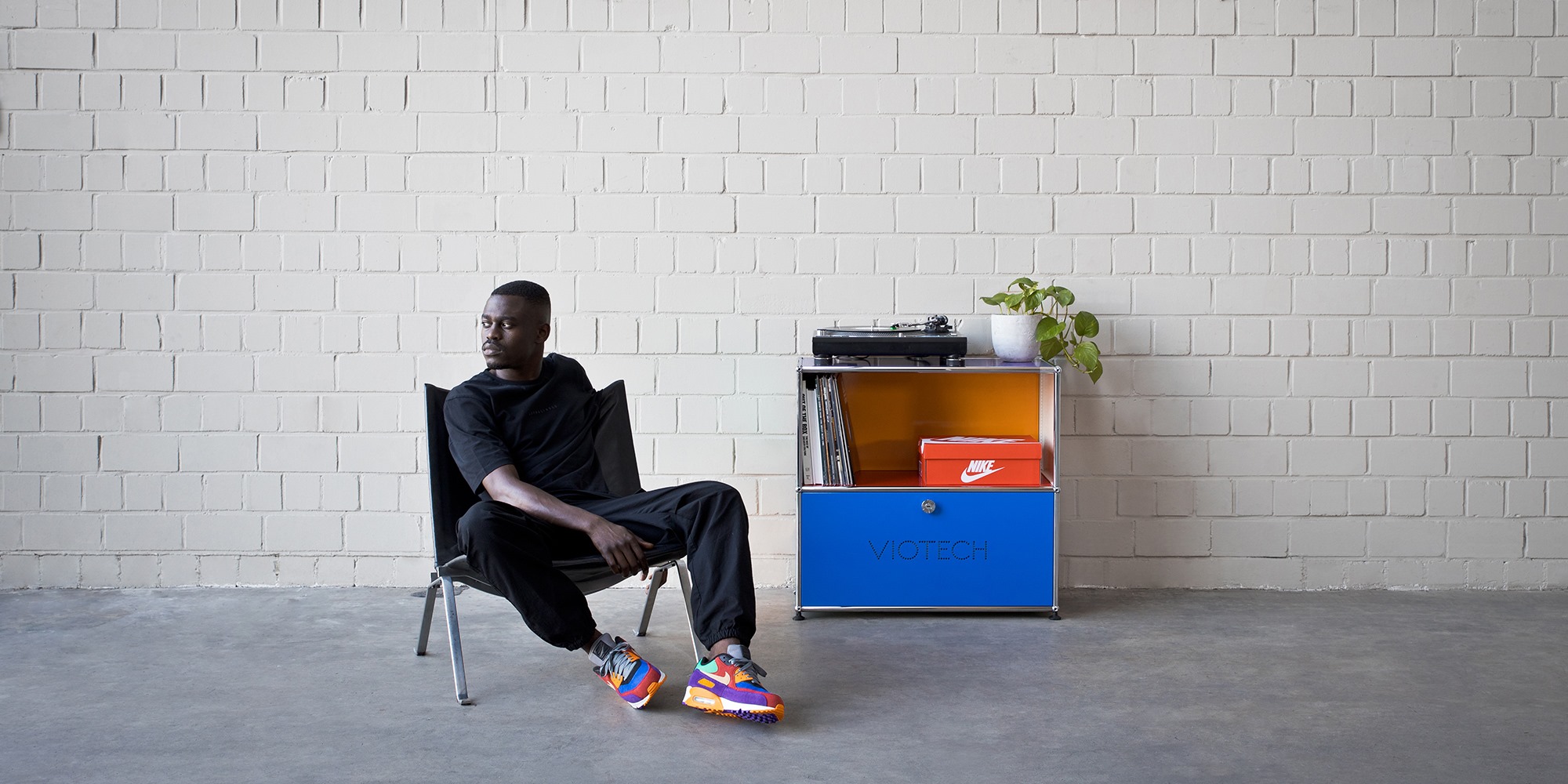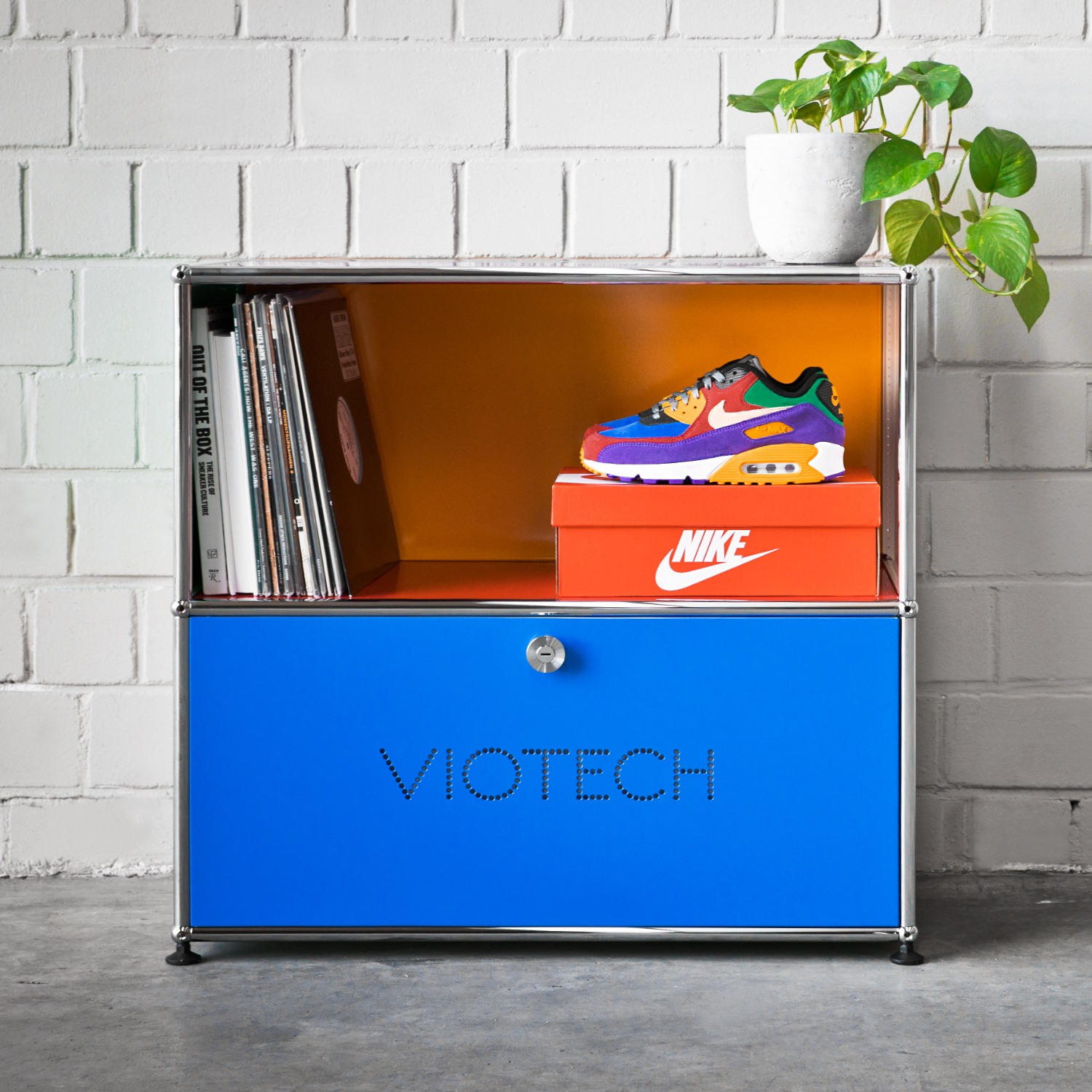 Ein Mix aus funktionellem Background und einzigartigen Klassikern macht die Air Max-Family in der heutigen Zeit zu einem einmaligen Lifestyle-Produkt. Da für uns das Jahr 2019 ganz im Zeichen von Design und unserer Passion für Interieur steht, haben wir in diesem Kontext ein passendes Gegenstück zum Air Max 90 gesucht und gefunden: Exklusiv zum Release des OG-Colorways haben wir ein USM-Haller-Regal in eine limitierte asphaltgold VIOTECH BASE verwandelt. Diese Base greift die Farben des Air Max 90 VIOTECH auf und steht genau wie der Kult-Sneaker für 100% Funktion und Lifestyle.