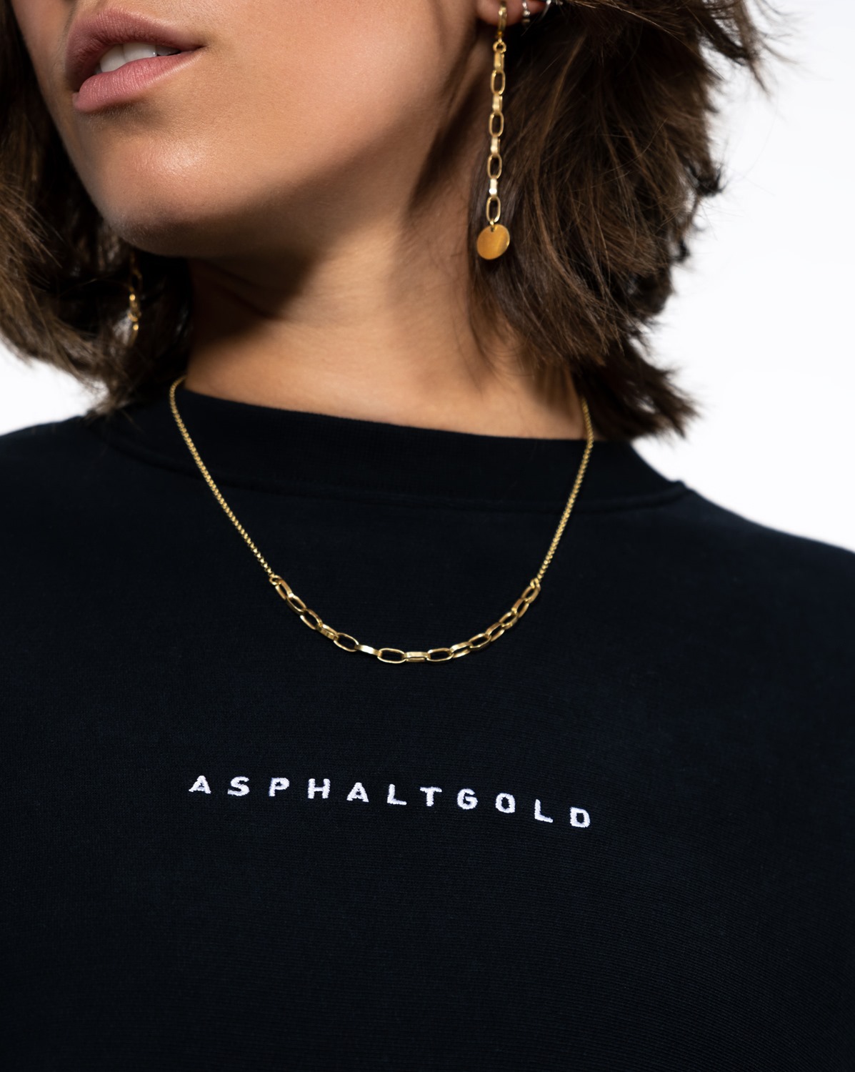 Der erste Drop besteht aus insgesamt drei Streetwear-Klassikern: Tees, Crewnecks und Hoodies, die jeweils in verschiedenen Farben erhältlich sind. Mit den Größen XS bis XXL garantieren wir, dass für jeden von uns das richtige Teil dabei ist! Neben Farbe und Material ist vor allem die Passform ein weiteres wichtiges Kriterium. Alle Pieces sitzen locker, aber nicht zu boxy und haben jeweils eine leichte Drop-Shoulder-Form. Die Liebe zum Detail spiegelt sich im perfekten Fit und der ausgewählten Machart wider. So sind beispielsweise die Crewnecks und Hoodies aus komfortablem French Terrygefertigt. Wir haben uns bewusst für unser neues Skript-Logo entschieden. Mittig platziert unterstreicht der hochwertige Stick den Anspruch an ein zeitloses Design. Dieser understated Look wird ergänzt durch das seitlich angebrachte Flaglabel mit den berühmten Streifen der ASPHALTGOLD Katze.